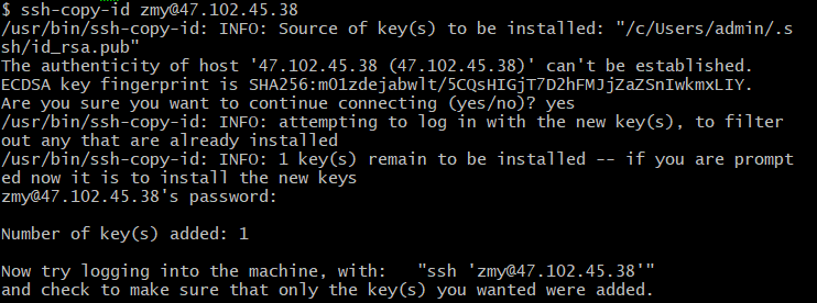 ssh-keygen根据提示生成以后,会在/.ssh/目录下生成相关的文件。这里的指的是用户的目录,比如,在linux下abc用户的目录为/home/abc,root用户的目录为/root,在mac下是在/Users/<用户名>将公钥id_rsa.pub拷贝到目标机器上 scp ~/.ssh/id_rsa.pub zmy@47.102.45.38:~/ 这行命令将当前用户的公钥拷贝到远程机器的root用户目录下 ssh zmy@47.102.45.38 cat id_rsa.pub » ~/.ssh/authorized_keys #加入信任列表 rm id_rsa.pub #删除公钥 exit #退出远程机器 这时已经返回到当前机器,再执行sshzmy@47.102.45.38就不再需要输入密码了
